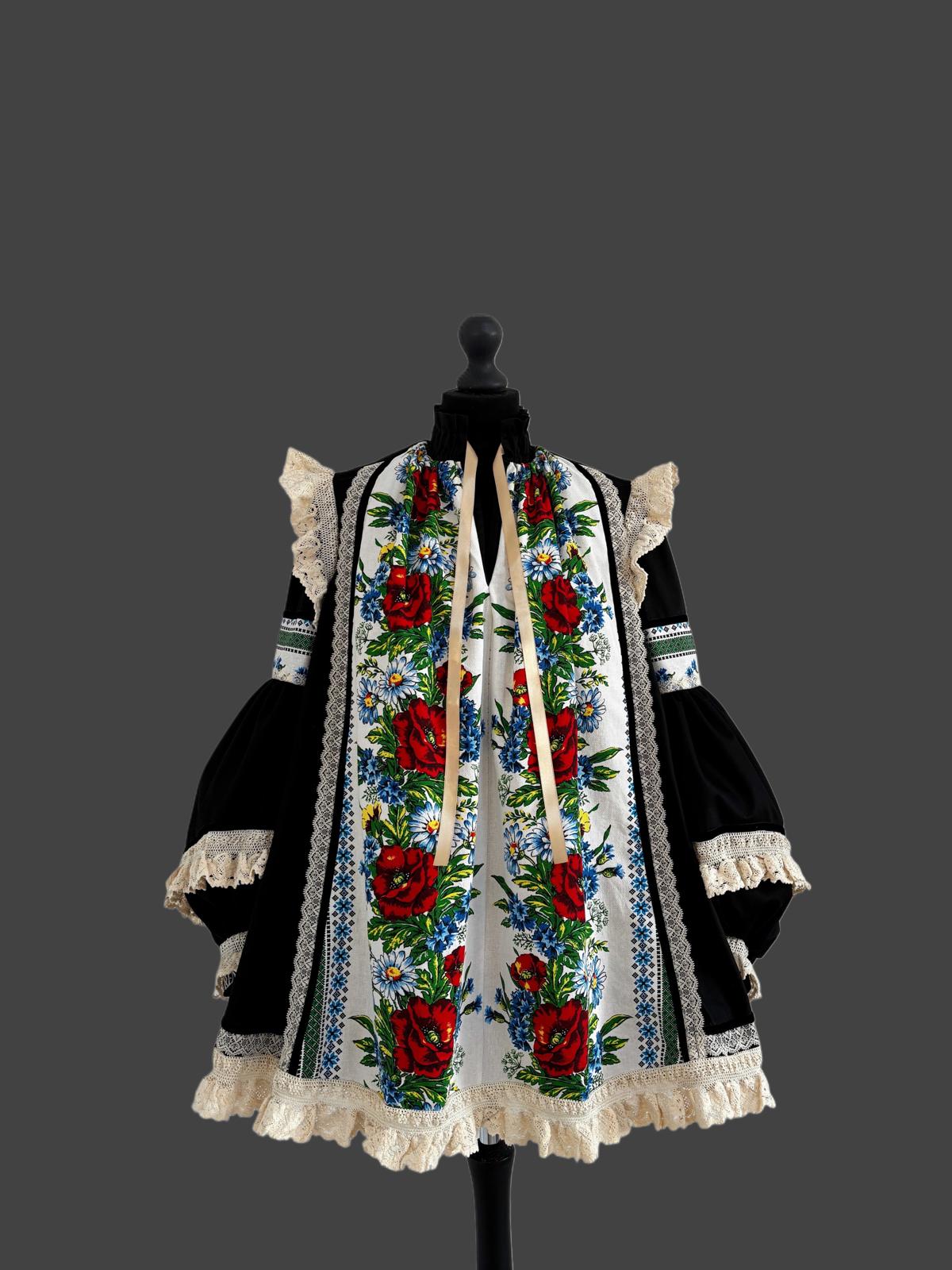 Gulerul înalt, decorat cu volănașe și șnururi delicate, subliniază rafinamentul piesei, oferindu-i un aspect regal și nostalgic.